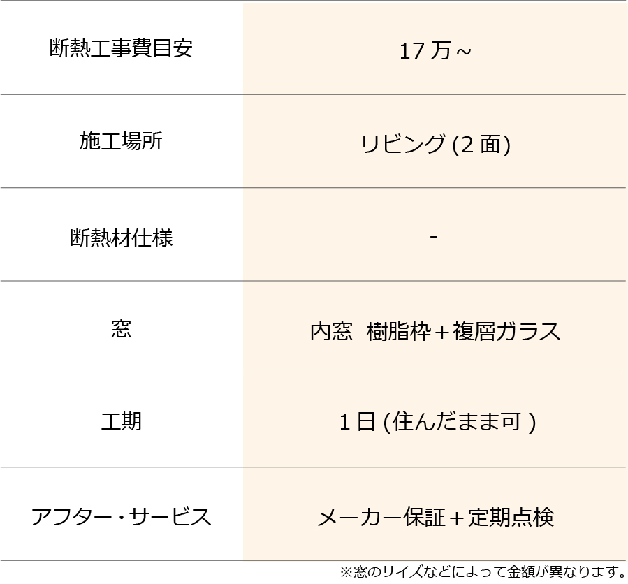 また、解体工事が必要ない非破壊工法のため工期は最短1日と短く、工事費用も大幅に削減できるので費用対効果の大きい断熱です。追加する予算にもよりますが、さらに断熱性能の高いトリプルガラスやガス注入タイプなどにも対応できます。